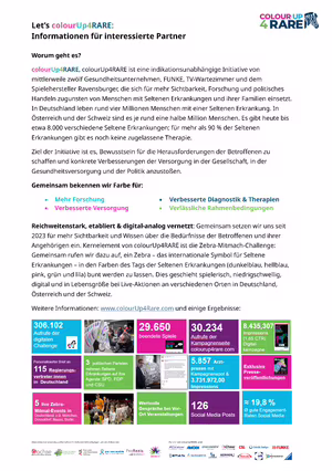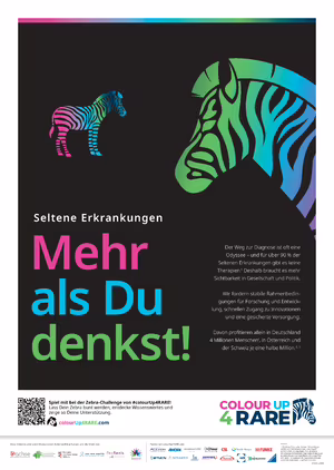 colourUp4RARE ist eine Initiative von zwölf Gesundheitsunternehmen, FUNKE, TV-Wartezimmer und dem Spielehersteller Ravensburger in Deutschland, Österreich und der Schweiz. Sie unterstützt Menschen mit Seltenen Erkrankungen, ihre Familien und die Arbeit der Allianz Chronischer Seltener Erkrankungen (ACHSE) e.V., der Care-for-Rare Foundation, der Eva Luise und Horst Köhler Stiftung, Pro Rare Austria sowie ProRaris Schweiz.